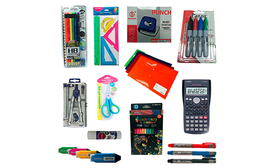 El kit contiene: calculadora, perforadora mediana, juego geométrico flexible 30cm, compás freehand, 1 sobre plástico con broche tamaño A4 varios colores, goma en barra 36g, borrador blanco retráctil, bolígrafo grip 0.7 azul, bolígrafo grip 0.7 negro, bolígrafo grip o.,7 rojo, lápiz HB tri neon + saca punta, tijera ergonómica 7”, colores triang. X12, marcador permanente x4.